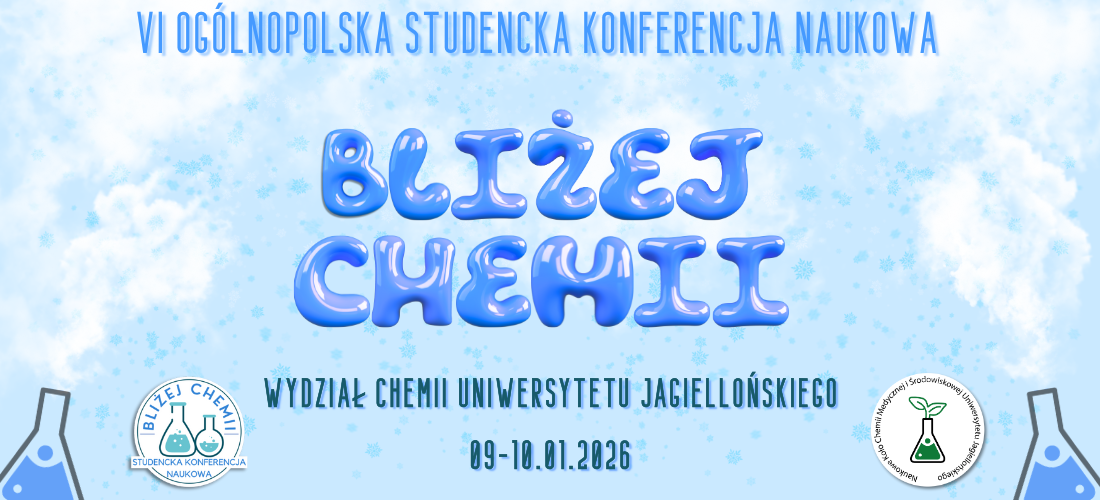 Naukowe Koło Chemii Medycznej i Środowiskowej UJ serdecznie zaprasza na VI Ogólnopolską Studencką Konferencję Naukową „Bliżej Chemii”, która odbędzie się w dniach 9-10 stycznia 2026 roku na Wydziale Chemii Uniwersytetu Jagiellońskiego w Krakowie.