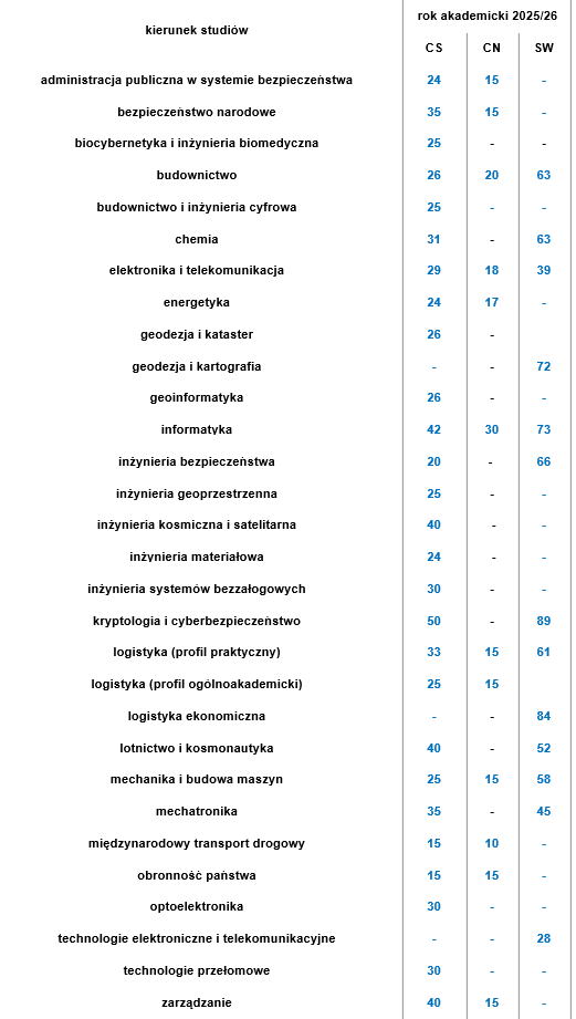 Progi punktowe - Wojskowa Akademia Techniczna im. J. Dąbrowskiego w Warszawie